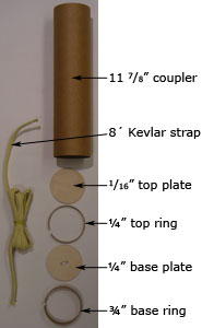 The two plates are 1/16" and ¼" plywood, cut to fit inside a coupler. Note that there is no hole in the top plate and the bottom plate has an elongated hole for the ½" Kevlar® strap to pass through.