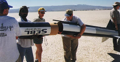 "Balls" (or FireBalls) is held once a year at Black Rock, Nevada. This launch features experimental rocketry (non-commercial motors) and large rockets. The main attraction for me at Balls 008 (August, 1998) was launching the Big Kahuna. This rocket was a monster to manage all the way through the project, and launching it was no exception. It didn't fit in my suburban because the fins added too much size at the top, so I had a courier drive it up to Black Rock while I took the rest of the rockets and supplies in the suburban. Many of my coworkers came, most of them in a limo; They know how to travel in comfort!