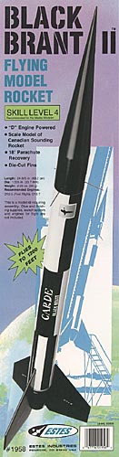 The Black Brant II is a "scale" model of a Canadian sounding rocket. This is Estes kit #1958. Kit information and a full-size picture of the front of the package is here. This was a good kit and I enjoyed building it.
