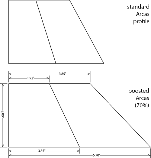 Above you can see a comparison of the lengthened fins to the standard Arcas profile. I decided to maintain the profile shape for interest, although it's difficult to determine what it's supposed to be from the photos I found (see Historical Info. below).