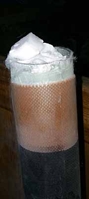 Releasing the part from the mandrel turned out to be quite a challenge. The idea we had was to shrink the aluminum mandrel with cold. (Aluminum has a very high coefficient of thermal expansion, which was why I chose it for the mandrel material.) Our first try was packing the inside of the mandrel with dry ice (frozen CO2), but this wasn't quite enough to release it.